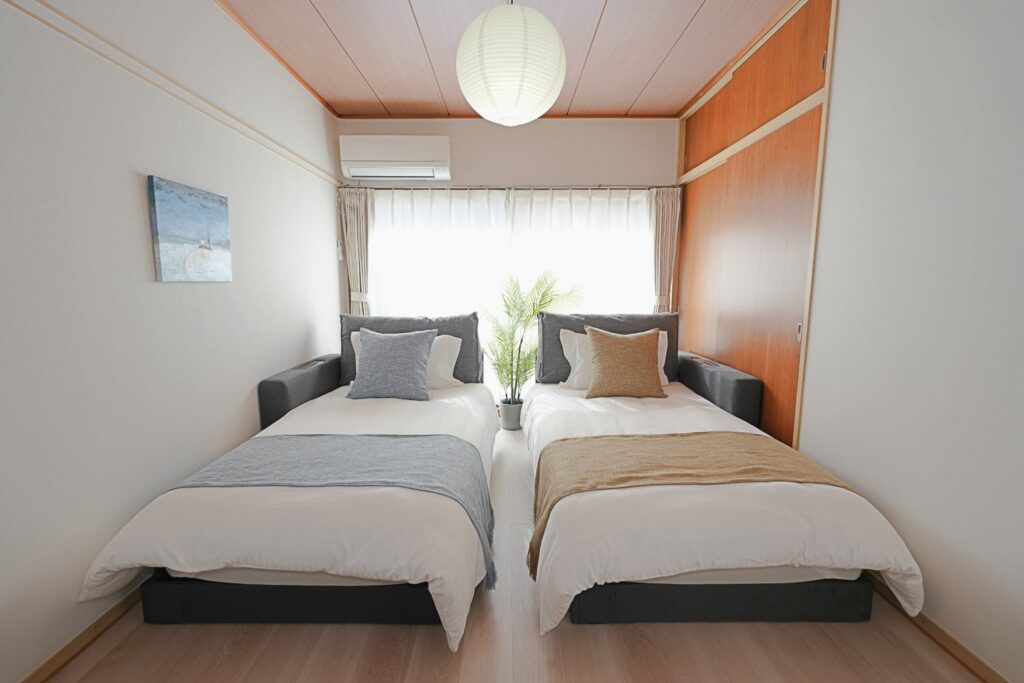シングルベッドを2台設置。連結してキングサイズベッドにすることも可能。
