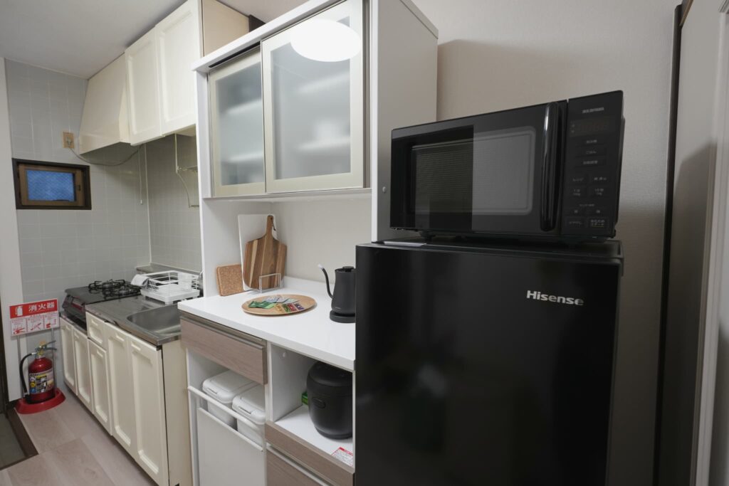 | 【キッチン設備】 ガスコンロ/冷蔵庫/電子レンジ/電気ケトル/フライパン/鍋/ボウル/包丁/まな板/おたま/トング/深皿/中皿/小皿/マグカップ/グラス/カトラリーほか ※衛生面の観点から、調味料はご用意しておりません。 | |